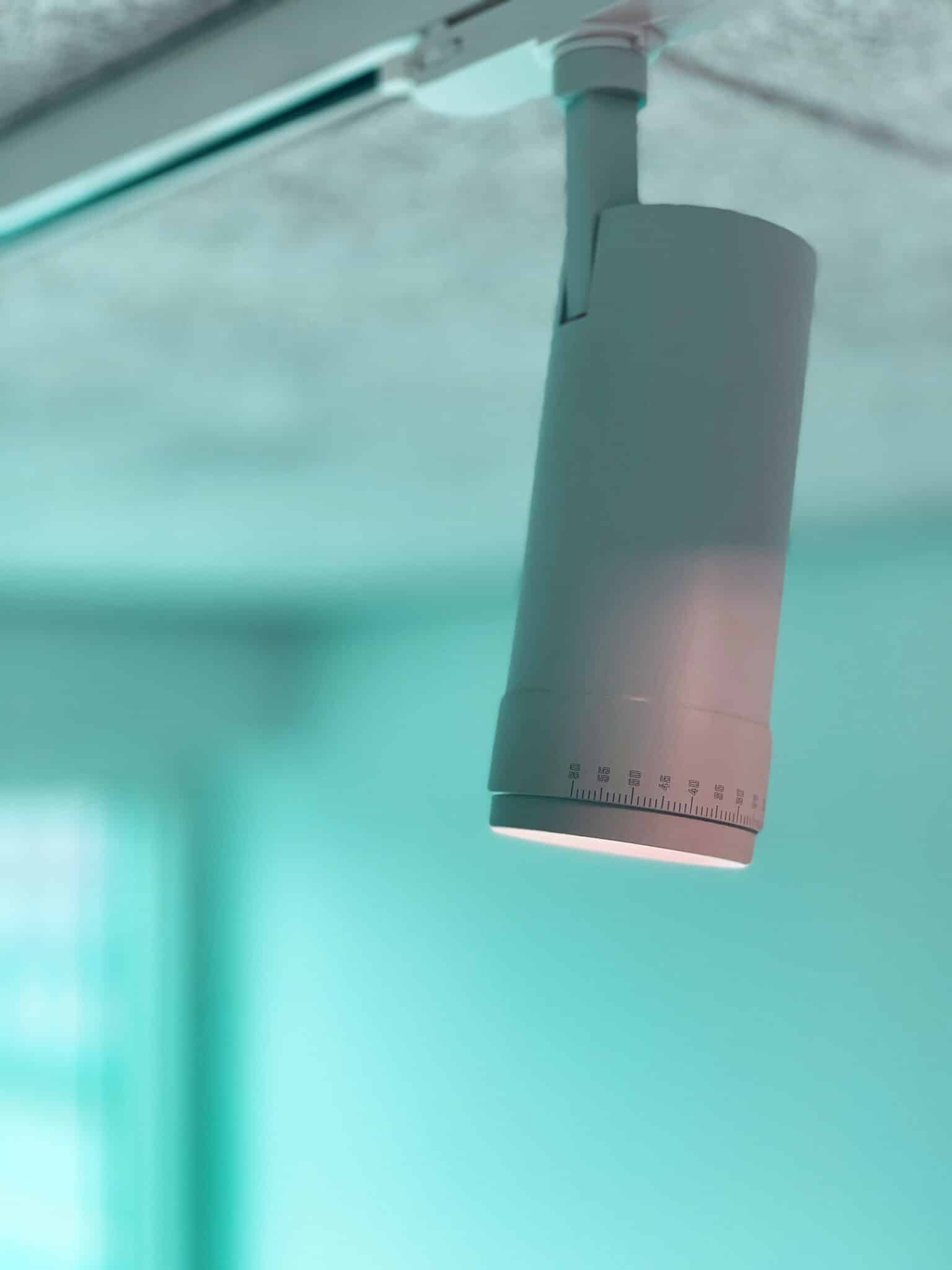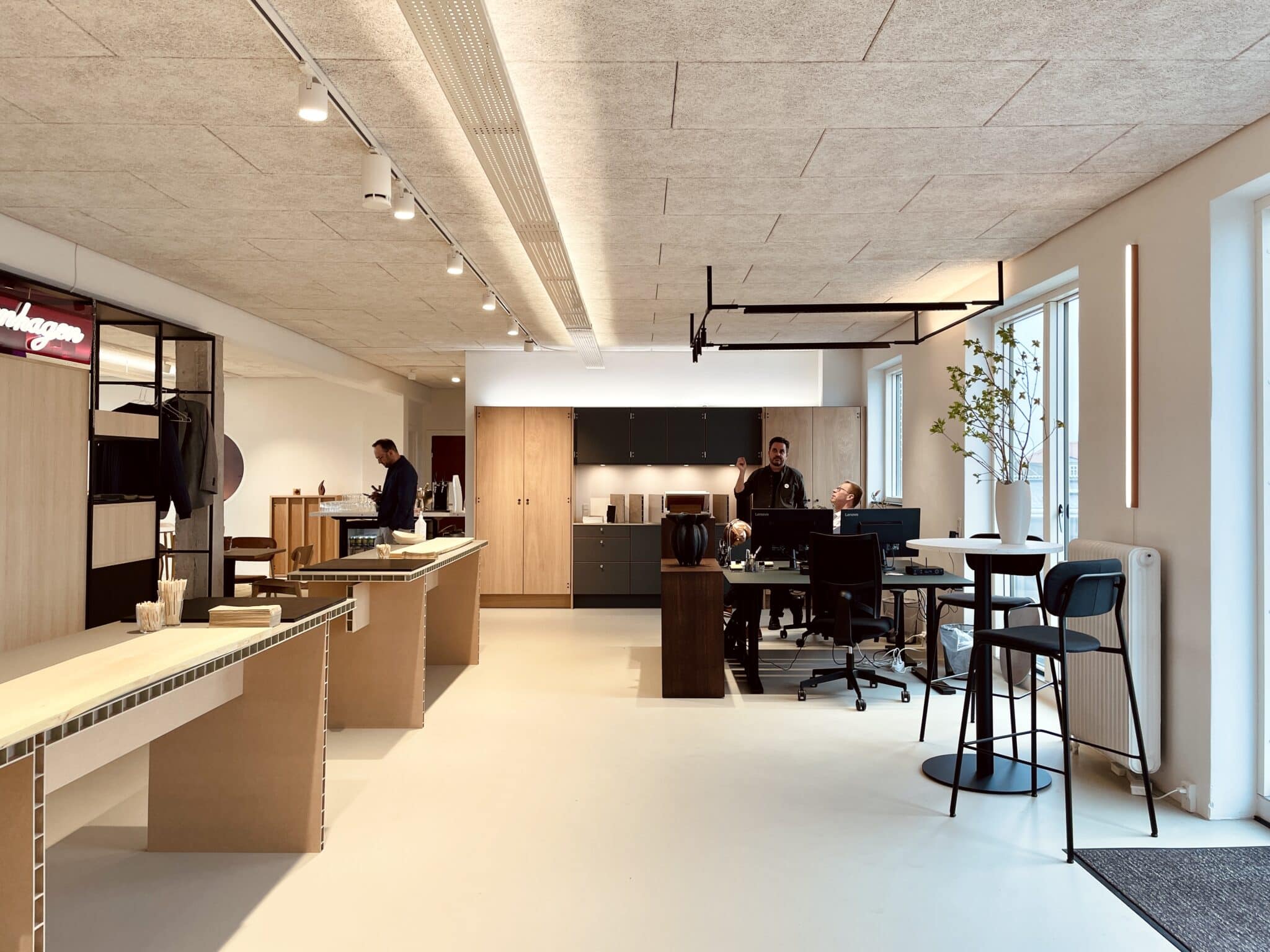 Grundlyset af spots i strømskinner skaber fleksibilitet i det lyse showroom på 2. sal hos Design District.