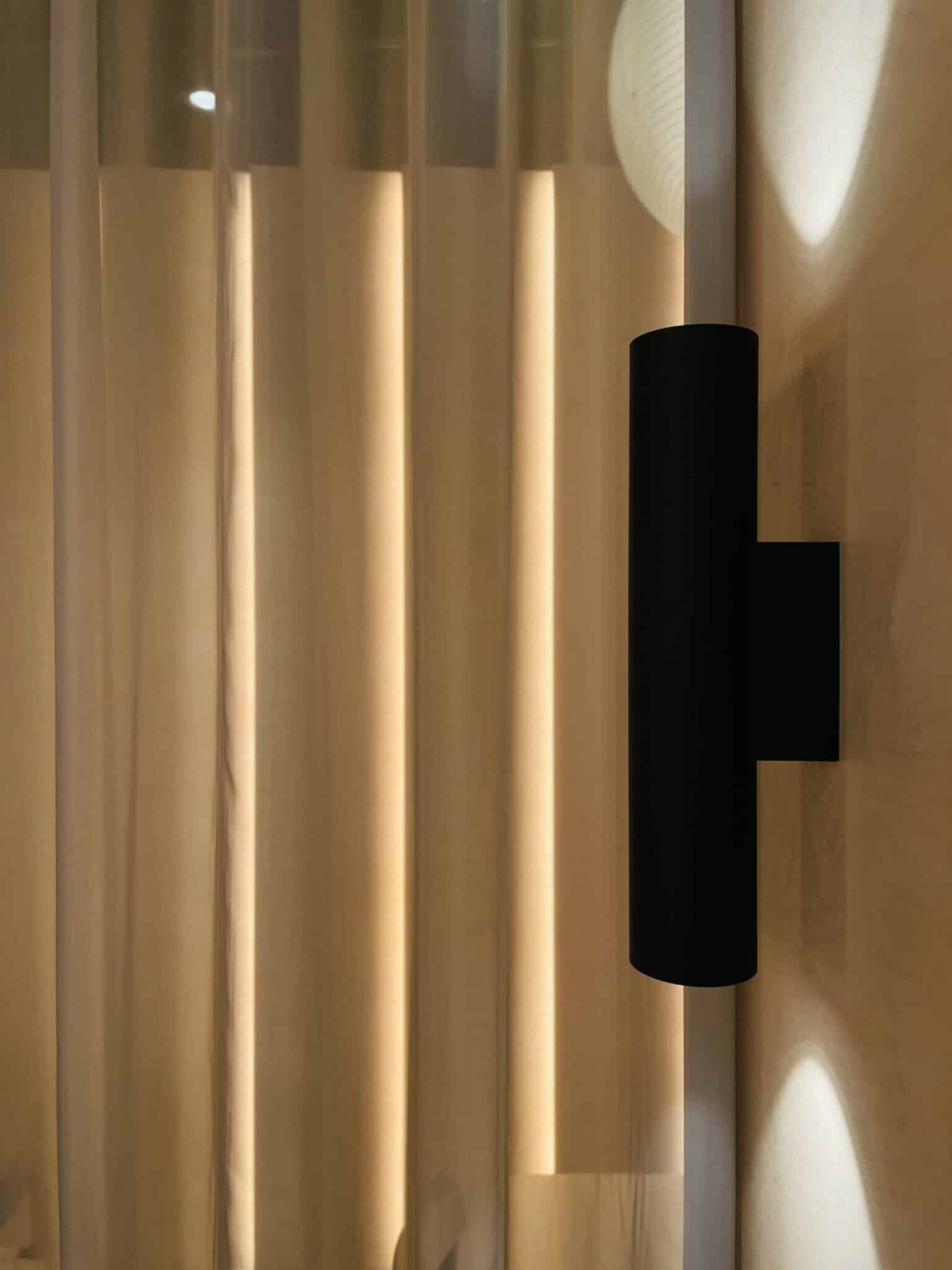 Løsningen omfatter bl.a. LED-strips monteret bag træpaneler, der spreder en varm hvid glød og indhyller rummet i behagelig belysning. Samtidig tilføjer minimalistiske væglamper og pendler i cylinderdesign et strejf af elegance.